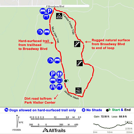 Trail length plus more: There are two distinct sections. The hard-surfaced Mica View Trail is 0.8 miles, followed by 1.2 miles on the Cactus Forest Trail, closing the loop with a crossing over Javalina Wash, back to the parking lot. An alternative is to do an up-and-back on the wheelchair-friendly Mica View Trail for 1.6 miles roundtrip, Gain 70’, Elevation 2800’